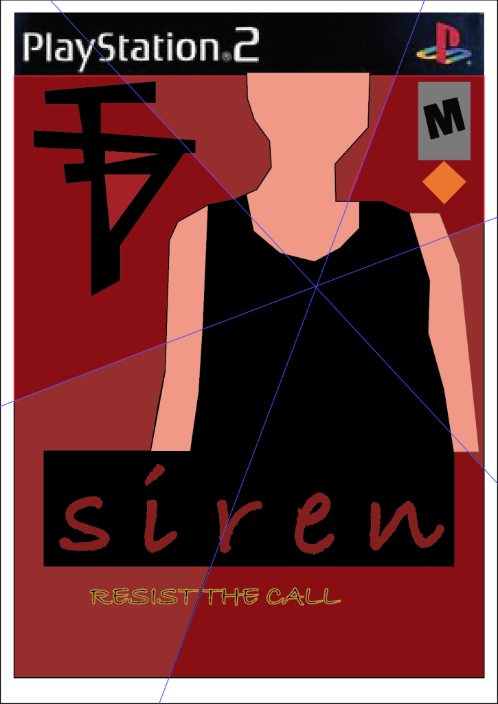 This is my improved version of the bad composition cover. I have improved this firstly by removing the confusing background and adding 6 shapes which all point to the centre of the woman, this is because I want the eyes of the users to shift to the woman as she is the main centre piece of the game. Secondly I changed the location of a few things such as the title, Chinese symbol and the games ratings to appropriate places to make the cover less confusing and more appealing to the eye. I moved the title “resist the call” to the bottom near the “SIREN” as the full title should be together and not scattered across the page. Lastly I increased the size of the woman as she is the main villain of the game and I wanted people to shift their eyes towards her more and show that she is important.