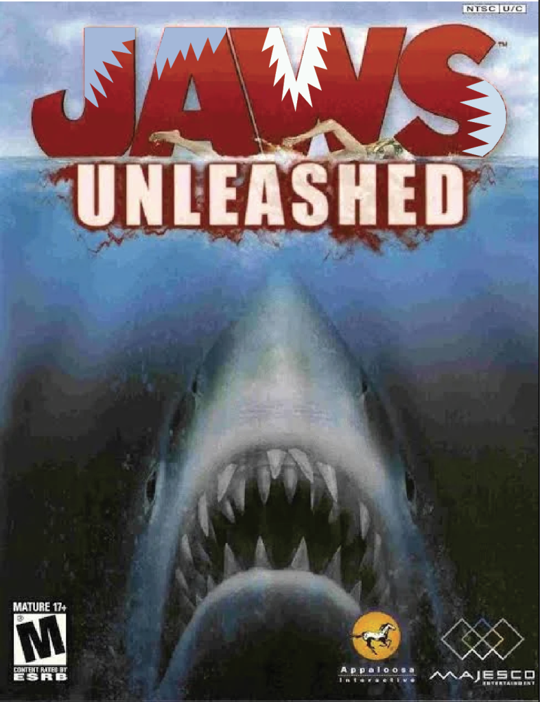 This is my improved version of the “JAWS UNLEASHED” game cover. The first thing I did was alter the “JAWS” letters from the title, I did this by adding shark bite marks on every letter. These bite marks imply that the game is all about a shark going around eating everything that moves in order to get bigger and stronger. The bite marks also correlate with the word “JAWS”, this is because a sharks main purpose with their jaw is to bite. Within the bite marks I have also changed the colour from blue to white, this is because I wanted to make the bite mark look see-through as if part of the letter is missing and you could see the sky background through it. I have only taken part of the word out instead of the majority of the word, this is because I wanted the word to still be readable after the bite so the user could easily identify the game.