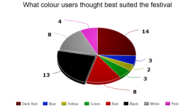 Based from user feedback I have created a pie chart of the most popular colours chosen to represent the festival/event. The most popular two colours are Dark Red and Black with White and Red just behind. However a decision was made to incorporate two more colours towards the colour pallet as only two colours can be very limiting to the festival on certain areas of the website or mobile application, therefore White and Red will be added into the pallet as they were chosen as the next most popular colour by the users in the pie chart above.