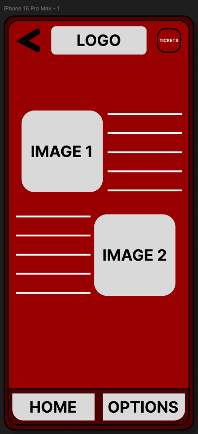 There are a few design flaws within the mobile application such as the tickets button being at the top right with a wrong choice of colour as it blends in with the background. Secondly the images in the middle must be enhanced by size as there is a lot of “white space” within the screen. Next the back button on the top left should be ultimately removed as it would lead to nothing because the page shown above is the main menu page. Additionally the buttons on the bottom are too big and must be polished for aesthetic purposes. Finally the logo should be loved somewhere else, this is because the majority of iPhone now have a “Dynamic Island” which hinders the view of the logo, moving it would benefit the brand identity as the users would be able to see who they’re purchasing from etc.