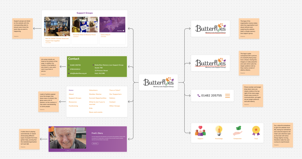 This is an organisation that primarily focuses on support from people that unfortunately get diagnosed with dementia, with the addition for support of their families. This is done by having the whole family enjoy days out and activities together to make life easier for the families living with dementia. Similarly to Oshi, Butterflies also primarily operates on a website which you can read upon what the organisation offer and why it was created. The style of the website is very fun and colourful, this can be seen with the animations and splash of different colours used across the website.