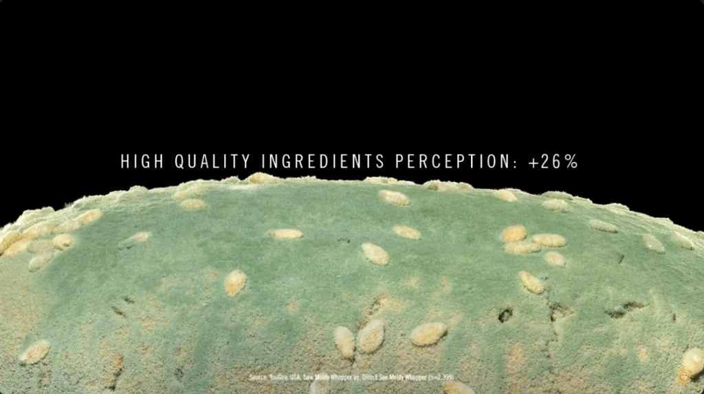 Burger King’s campaign was notably honest, bold and disruptive. Instead of relying on traditional mouth-watering advertisements, the brand chose to present a decaying burger to highlight the natural ingredients used in its products. This approach aimed to contrast Burger King’s burgers with those of competitors, which often contain preservatives that slow down the natural process of decay. The advertisement also used strong juxtaposition. This is evident in the closing tagline, “The beauty of no artificial preservatives.” While the video shows a burger gradually rotting, the tagline reframes this process as something positive, emphasising authenticity and the idea that natural food follows the rules of nature rather than resisting them.